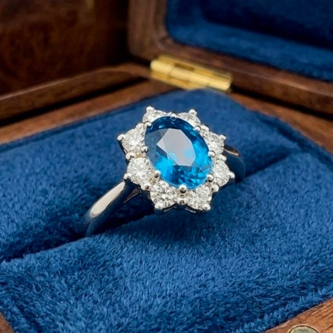 Rosettring i 14 karat hvitt gull med blank overflate og 12 briljantslipte diamanter i Wesselton/SI og 1 fasettslipte blå safirer)29000kr