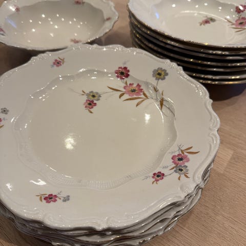 Selger et servise med gullkant og blomstermønster.