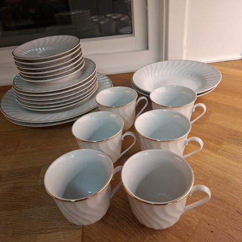 10 store tallerkener uten skade, og 8 skåler uten skade.