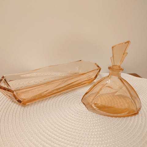 Har også et liknende sett i rosa glass fra samme periode i separat annonse.