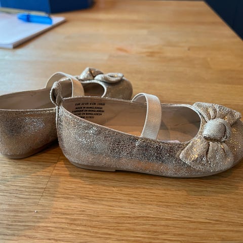 Søte ballerinasko til baby. Gullfarget med glitter-sløyfe. Strikk over vrista. Så og si ubrukte.