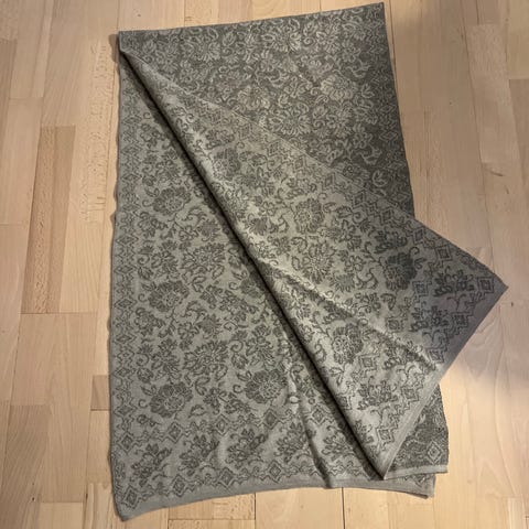 Tilstand? Pent brukt. Noe krøllete etter vask/oppbevaring. Har vasket med hvit milo, på 20 grader ullvask. Forbehold om nupper/løse tråder etc. God tyngde. Nydelig farge.