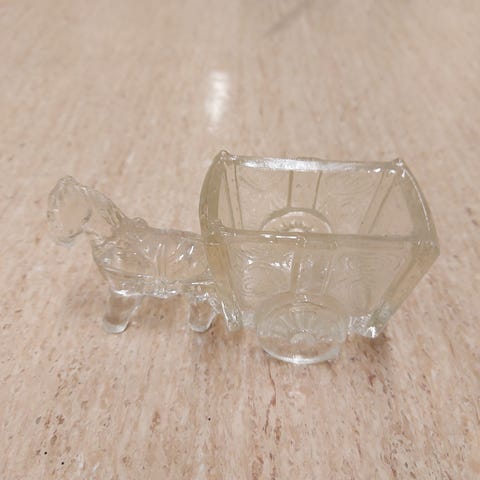 Vintage hest med vogn i hvitt pressglass