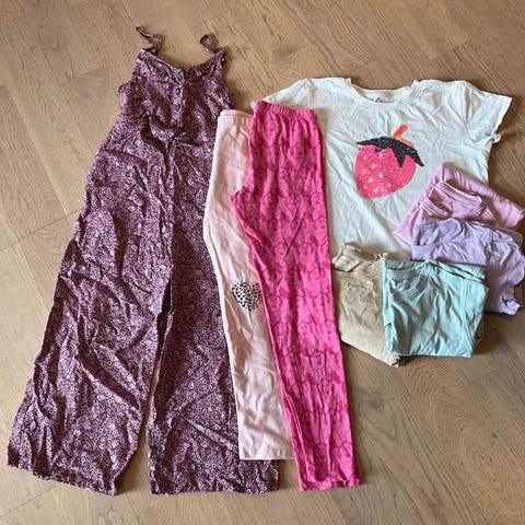 3x bukser, 1 x kjole,2 shorts og 1 t-shirt.