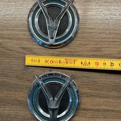 2 stk. vintage Opel emblemer. Ser ut som om disse har vært til type Opel personbil, som f.eks. eldre Opel Kadet eller tilsvarende. Lengde 11 cm. Alle festepinner intakt. Se bilder for beskrivelse.