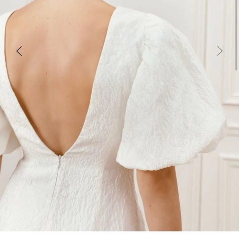 Stilig og elegant brudekjole med puffermer og v/-hals. Har også delvis åpen rygg med en v-åpning. Stoff med struktur som gir det lille ekstra. Dette er kjolen for deg som vil ha en elegant, men leken kjole som du fritt kan bevege deg i.