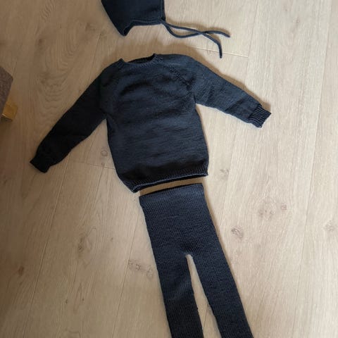 Hjemmestrikka ullgenser og friends ullbukse selges (str. 128)