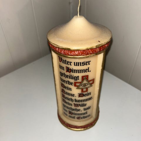 Håndlaget lys av resirkulert stearin. 9,5cm høy.