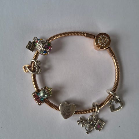 Selger ett armbånd med charms og ett halskjede med charms. Alt i sølv. Kjøpt i Pandoras butikk i Grebbestad (Sverige) for en del år siden. Lite brukt.