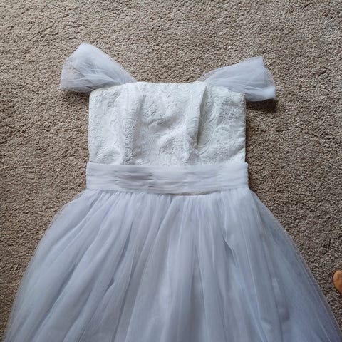 Jeg er 161 cm og bruker vanligvis S i klær. Brudekjolen er lagt opp hos skredder, men jeg har beholdt stoffet de klippet av så dette kan nok sys på igjen dersom en trenger mer lengde.