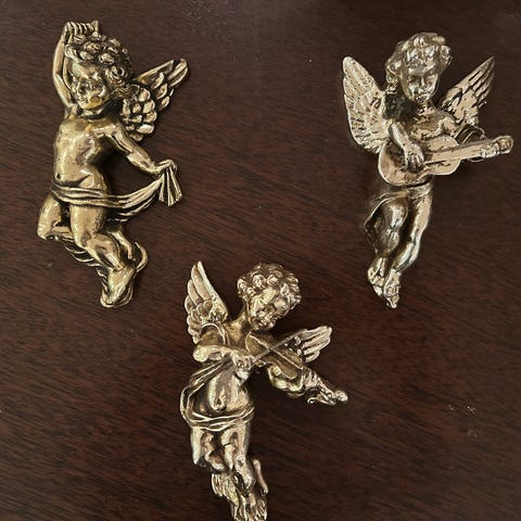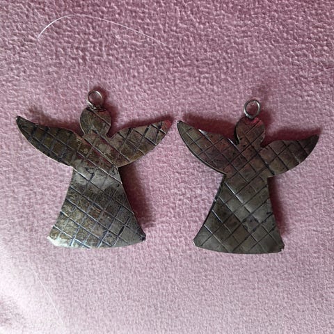 To engler i metall. De har en stift på baksiden og er sikkert fine til oppstser, kanskje til pynt på kubbelys osv. Usikker på alder. Fin stand. 7,5x5,5 cm. Prisen er for begge samlet.