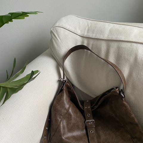 Lys rosa skinnveske/clutch. Avtagbar skulderrem følger med. Foret, en lomme med glidelås innvendig, og en liten karabinkrok til å feste nøkler etc.
