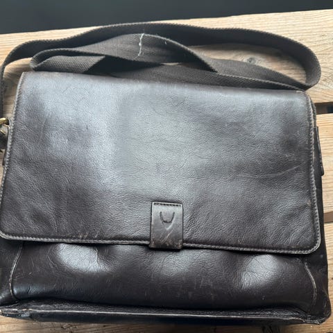 Solid PC-veske fra Chivago i sort lær. Skulderstropp mangler. Noen bruksmerker. Utvendige mål: B 40 x H 31 x D 11 cm