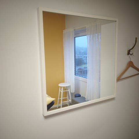 Nyere, ovalt hvitt speil laget i trefiber høyde 53,5 cm. + bredde 43,5 cm.