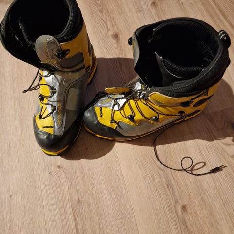 Kjøpte de i håp om å få brukt de på høyfjellseventyr i Nepal. Fikk hjerneinfarkt og forbud mot +5000 metere. Nedtur! Men det betyr at noen andre kan få bruk for disse skoene, og kanskje er det deg? Disse er ikke brukt eller prøvd på siden jeg kjøpte de på Sportsnett. Nypris er minst 6000 - jeg kjøpte for 7400. Med andre ord er rabatten meget god.