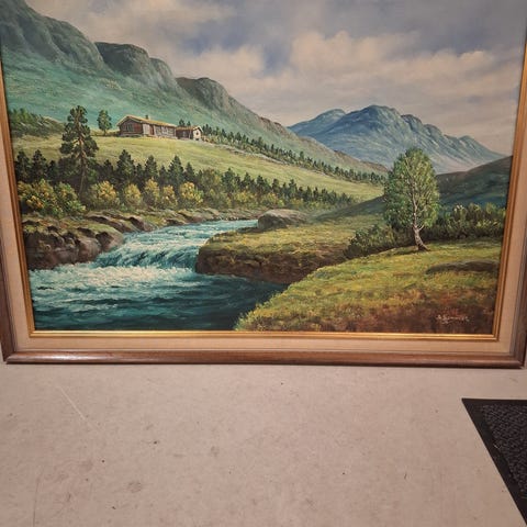 Maleriet er 60 cm bredt og 48,5 cm høyt. Rammen har en bredde på 6 cm. Kjempefint maleri og kjempefin ramme.
