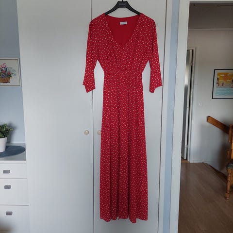 Brukt 1. gang. En lekker, lett og elegant kjole på. V-utringing, søm fra V-ring og litt ned og ut til siden, gir kjolen et pent snitt. En veldig fin og ‘snill’ kjole til alle fasonger. Farge sort, i en vakker velour, str. L. Vil si den passer 38-40++. Lengde ca 101 cm.