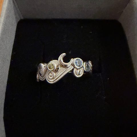 Den er i tilstanden "ny", noe som betyr at jeg ikke har brukt den og fremstår uten synlige tegn til slitasje, ringen er laget av rustfritt stål.