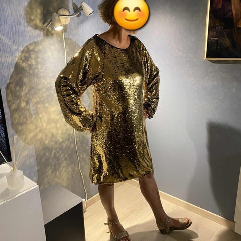 Den perfekte Jule- eller nyttårskjolen i glittrende GULL. Perfekt tettsittende passform, fotsi, lang ermet (varm til nyttårsrakettene) i full dekket i glittrende gull paljetter som er et blikkfang i seg selv.