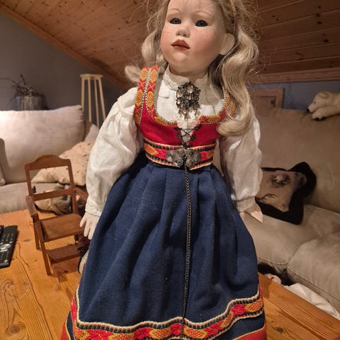 Høyden på dukken er 37 cm og total høyde er 64 cm.