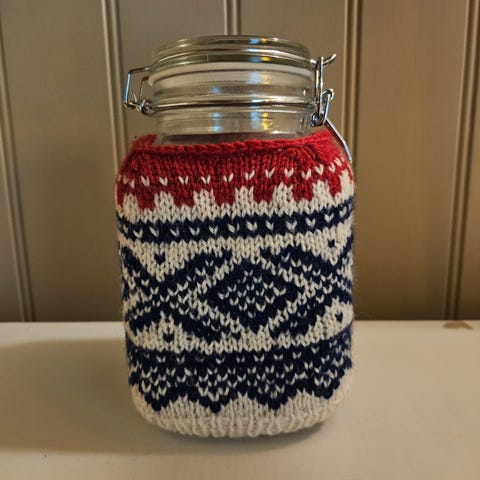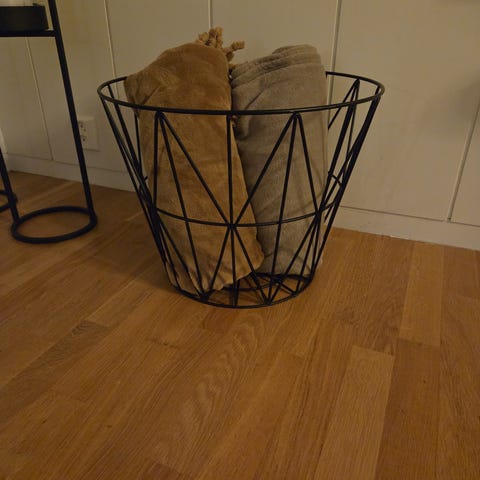 Veldig fint hjemmestrikket Marius trekk til vedbrikettboks. Lite og pent brukt.