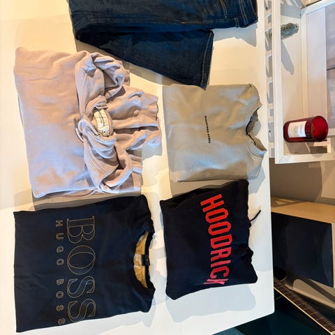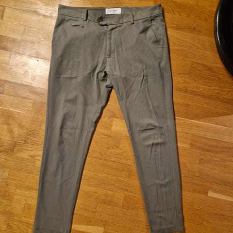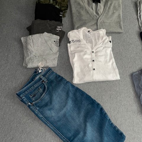 Merkeklær til herre selges grunnet lite/null bruk. De har ligget i et skap, derfor de har noen «brettemerker», men disse kan enkelt strykes ut eller så går de naturlig bort ved å bruke plaggene. Buksen har et lite bruksmerke (se siste bilde).