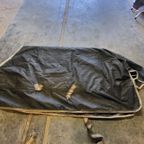 Dekkenet er ca 6 år gammelt, har noen små-lurvere kanter, og et bitte lite hull bak på kanten (se bilde), men er ellers helt og pent. Har alle reimer og spenner. Det står at det er 300g på merkelappen, men alderen har nok gjort sånn at det er mer som 200g. Blir ikke vasket før salg. 150kr