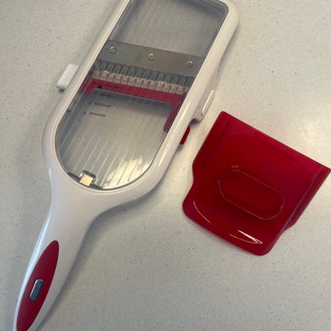 Helt ny MandoChef i original eske. Skjær og snitt terninger, staver, bølge- og vaffelformede kutt, raskere og med kun ett redskap. Med 2 knivblad kan du lage 8 forskjellige kutt. Katalogpris kr 1199,-. Kan hentes i Horten/Oslo eller sendes med PostNord til kr 69,-. Kjøper betaler frakten.