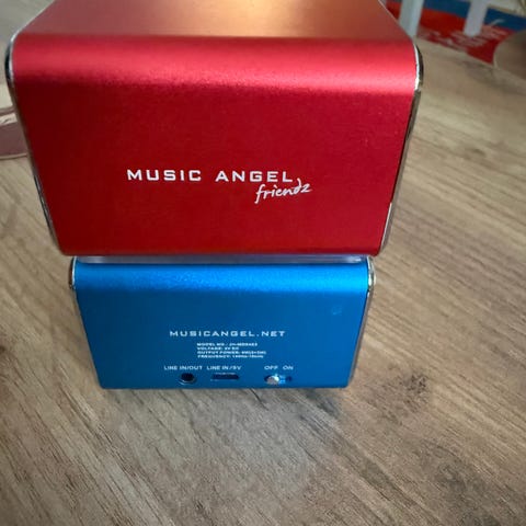 3 små høyttalere fra Music Angel friends selges fordi jeg ikke bruker de. Den lilla har en skade, men funker bra og resten er i perfekt stand😊