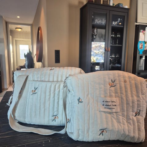 Godt brukt lekematte i fine blå nyanser. Myk og god puslespillmatte. Fin til å ha babygym på. Stor nok til å leke på sammen med barnet. Har vært populær her, så har noen riper, men masse bruk igjen.