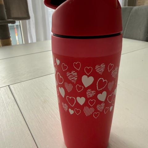 Rød med hjerter. Hjertene slites av i oppvaskmaskin derfor ser den slitt ut. Ellers fint og lite brukt. Holder 20-30 min på varme.