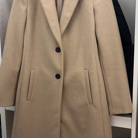 Ubrukt, hengt i skapet en stund. Flott beige farge, fint snitt. Røyk- og dyrefritt hjem. Nypris 1499,-