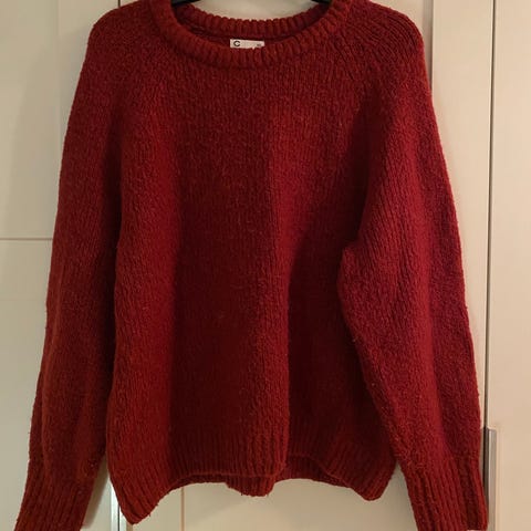Genser i rødoransje farge. Blanding av ull, mohair og litt akryl.