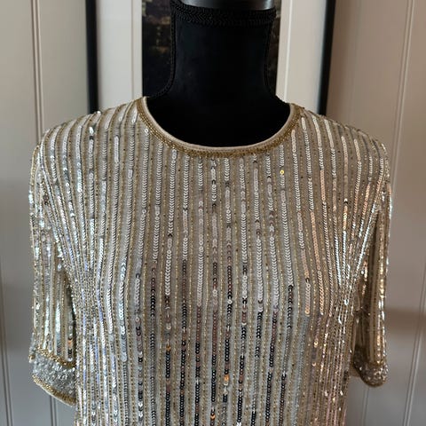 Topp til dame med hvite og gullfargede paljetter.