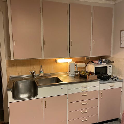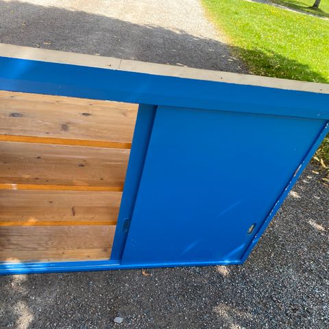 Alle skuffene er i orden. Hyllen er av tykk kryssfiner og kan lett males i annen farge 🙂