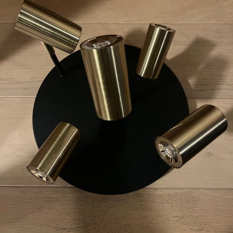 Selger en taklampe i gullfarge med 3 spotter. Lampen bruker E14 type pærer. 3 stk LED spotter følger med som vist i bilde.
