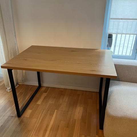 White oiled oak veneer 180x100 cm without split. Black metallic legs included.