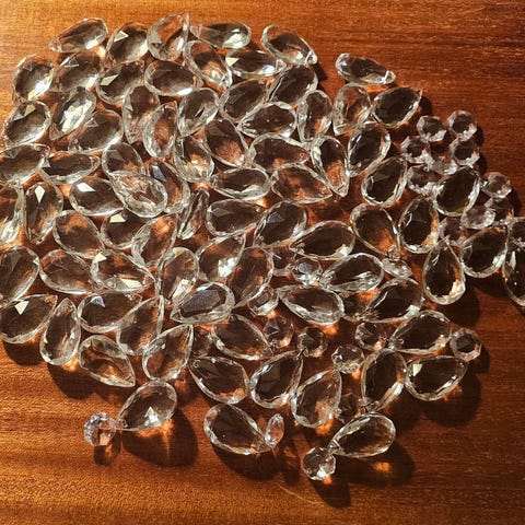 2 vegg prisme lamper og en prisme lysekrone( farge gull) selges for kr 400,- pr stk på vegg lampene og kr 800,- for lysekronen. Står a-b ribe metall på lampene. Fra 70- tallet