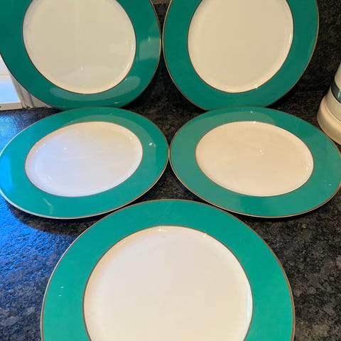 6 stk. tallerken 23,5cm. hvit porselen med gull og blå dekor.