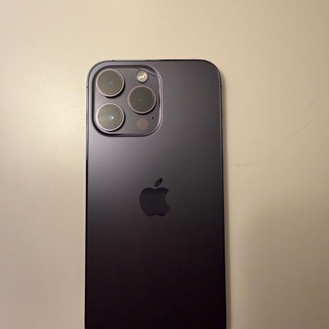 Jeg selger min iPhone 14 pro max. Telefonen har 256gb og har et lite merke på skjermen nede i venstre hjørne. Se på bilde.