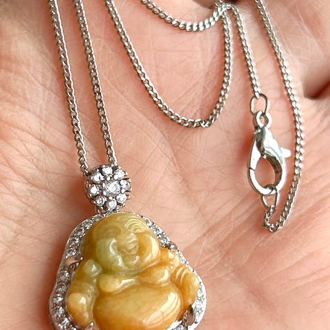 Vakkert halskjede av forgylt sølv. Anheng (engel) av ekte jade og zirkon.