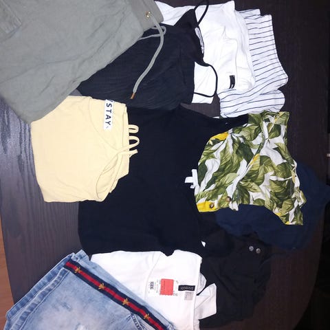 Veldig pent brukt pakke med forskjellige klær str.L Kjoler, bukser, bluser, jakker, badedrakt. Alt for 400kr.