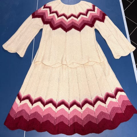 Hjemmestrikket kjole i ull/ bomullskvalitet. Har ikke lenger navnet på garnet. Kjolen et tykk og varm. Den passer dessverre ingen i huset lenger. Passer til jente 12-14 år, en X-small eller small