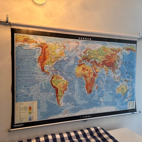 Et godt holdt kart. Noen løse biter oppe på kart i nordvest-Russland. Disse kan limes. Kun en liten bit på 1cm som mangler. Det er også en teip over Bangladesh.