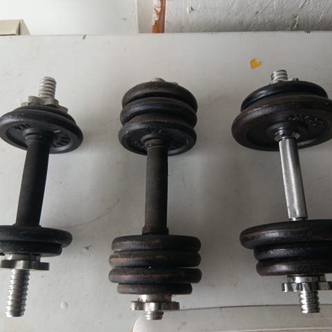 Kommer i par av 24, 26 og 32. Det følger med én hantel på 28 kg i tillegg.