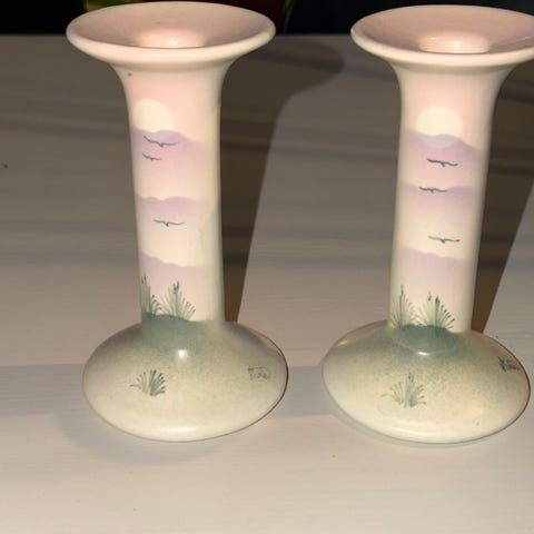 Selger to nydelige lysestaker av merket Sinclair Larvik, håndmalte. Vakker klassisk søyleform, med nydelige motiver av blomster. Ingen synlige merker etter jeg kan se.