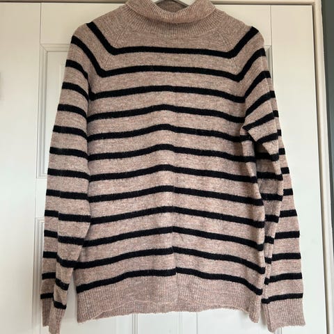 En pen mørkblå strikkegenser med flotte detaljer i strikken. Den er korrekt på Str. Helt ny og ubrukt. Nypris 1899.-