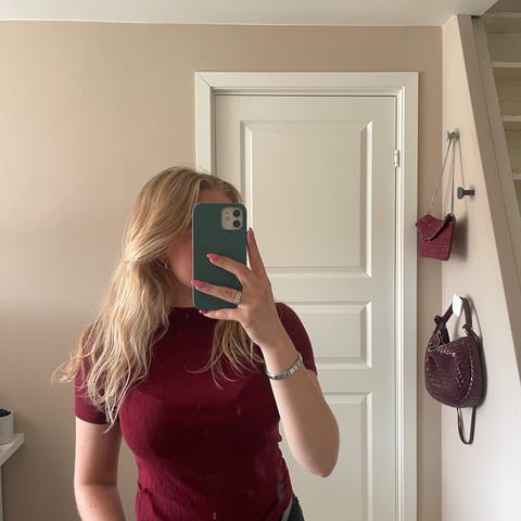 Nydelig vinrød T-skjorte med perler på ermene både foran og bak. Brukt 1-2 ganger.