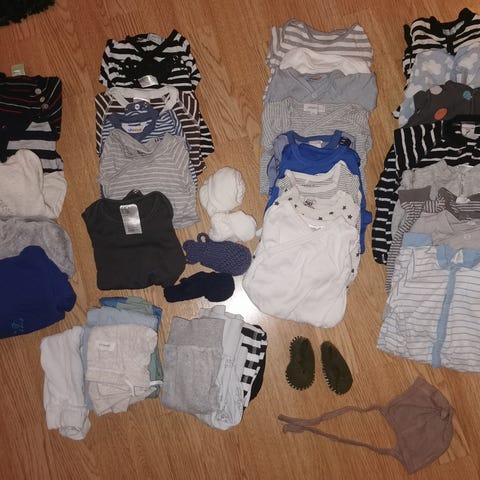 Tykk dress, pysjer, langermet bodyer, gensere, bukser, strømpebukser og sokker, luer, votter og tøfler (25 plagg).