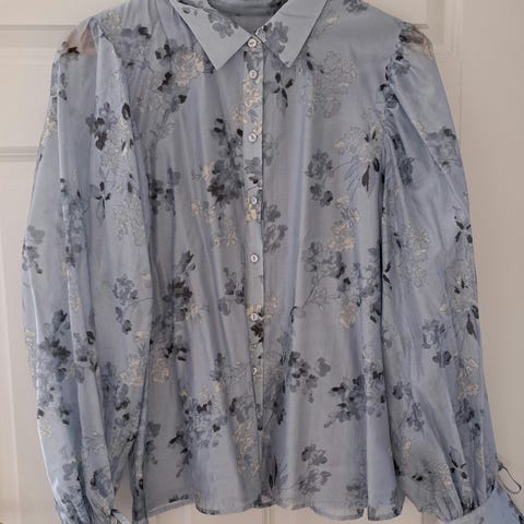 Tynn bluse med mønster. Krage. Knapper foran og på ermene.